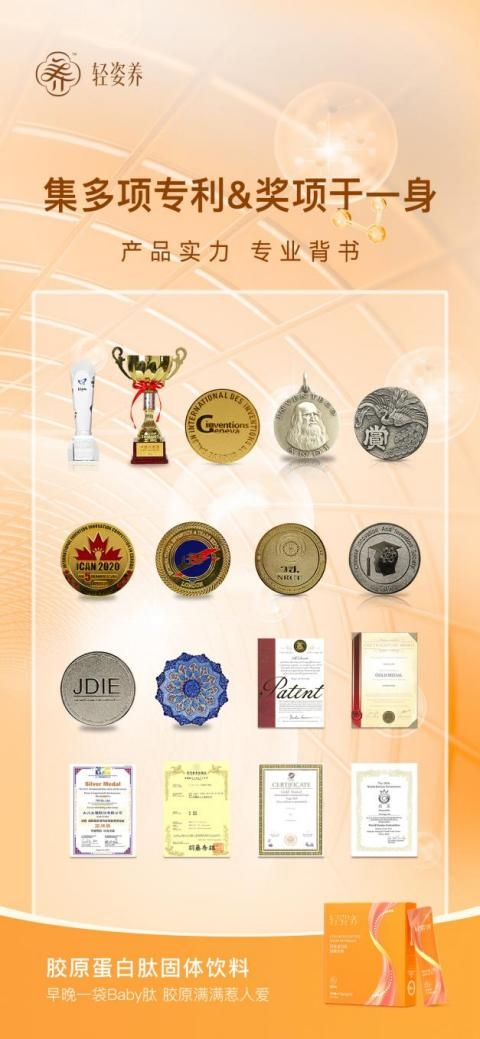 为不断提高品牌的创新科技实力和生产实力,轻姿养与大江生医等最具全球影响力的科技公司保持合作,研发推出了包括Baby肽在内的多款兼具年轻健康理念与创新科技配方的爆款明星产品,多次获得国际权威大奖认证。