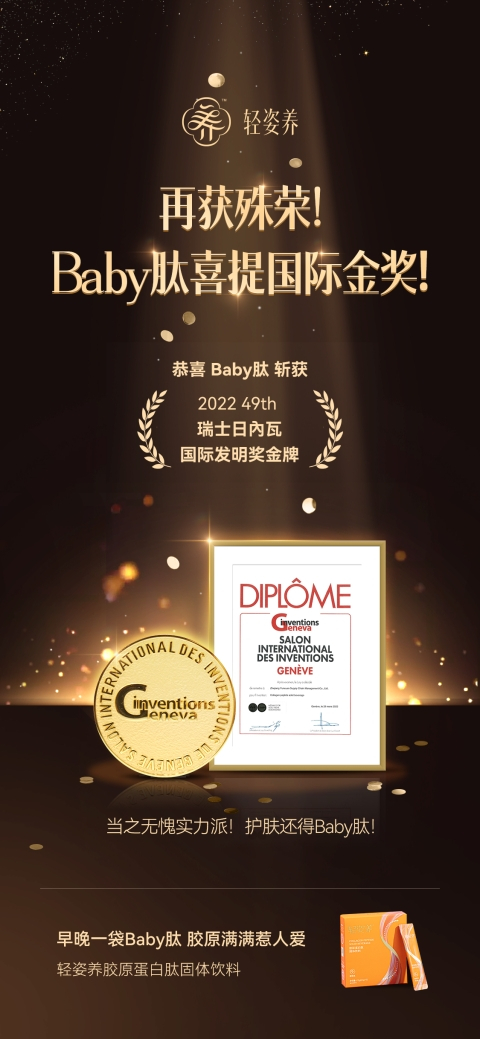 近日,在2022年第49届瑞士日内瓦国际发明展中,国内知名健康品牌轻姿养旗下产品Baby肽再获殊荣,一举斩获国际发明奖金牌。这是轻姿养继不久前的日本东京国际发明奖之后,斩获的又一国际大奖。Baby肽作为轻姿养旗下明星爆款单品之一,以突破性配方科技帮助补充胶原蛋白,其健康科技实力得到国际权威认证。