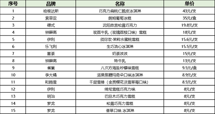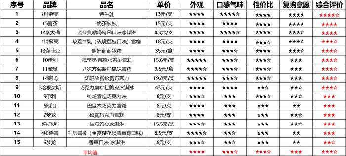 体验人员从雪糕冰淇淋的外观、口感气味、性价比、复购意愿等多个方面对编号1至15号雪糕冰淇淋进行打分(除口感气味满分为10分外,其它项满分均为5分,最低0分)。