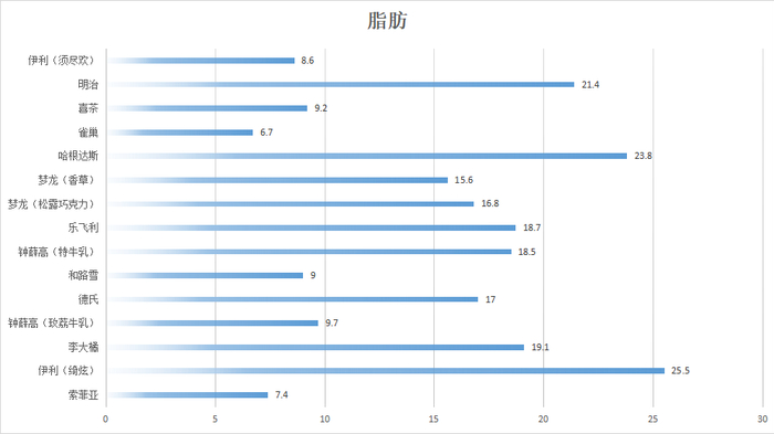经检测,本次所有样品脂肪的标示均符合标准要求,其中梦龙、乐飞利、千层雪、雀巢等品牌涉及的5批次样品标签标示营养成分表中脂肪含量不是以每100克计,实际测算每百克含量会高于标签标示值。本次15款样品的脂肪含量实测值为每100克6.7克至25.5克。其中脂肪含量最高的是标称为“伊利绮炫比利时巧克力脆皮香草味冰淇淋”的产品,脂肪实测值为25.5克/100克;脂肪含量最低的是标称为“雀巢8次方 海盐柠檬味雪糕”,脂肪实测值为6.7克/100克。