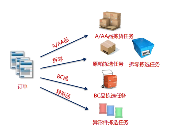作业任务切分管理:WMS系统可以根据系统配置,生成不同的拣货模式:如按单拣货、整箱任务拣货、拆零任务拣货、分区接力拣货、分区拣货合流、异型商品按单拣选,这些模式可以基于货主,订单类型,订单结构特征等进行灵活配置,同时可以自行配置出更多的拣货模式,而不需要客户化,如中央仓的商品可根据不同ABC分类原则设置不同的作业区域,同时对应不同的设备和作业策略;也可通过订单分析和波次策略进行任务切分,来满足出库拣货作业的精细化管理要求。
