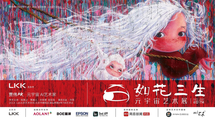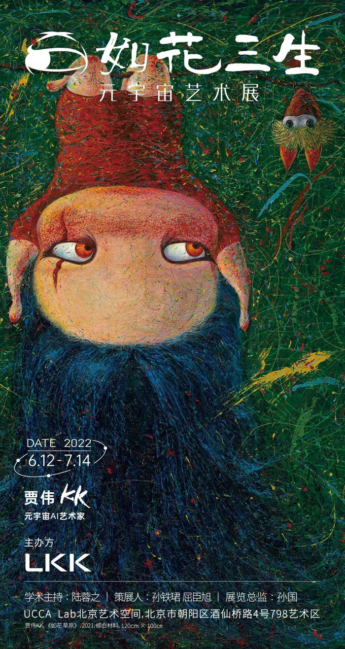 2022年6月12日-7月,元宇宙AI艺术家贾伟KK个展(首展)—— “如花三生”元宇宙艺术展于798艺术区UCCA Lab北京艺术空间正式开展。本次展览由陆蓉之女士担任学术主持,LKK洛可可创新设计集团主办,孙铁珺、屈臣旭担任策展人,展览总监为LKK创新设计集团市场总监孙国。展览通过本生、野生、元生三部分展项内容交织递进,除了架上绘画、雕塑等多种不同呈现形式的艺术作品之外,现场还有30万数字艺术藏品(NFT)联合数字智能交互场景多维呈现,共同打造出一场可沉浸式体验数字藏品的元宇宙艺术展。作为潮流元宇宙IP,“如花在野”将艺术、商业、科技相互融合,不仅结合音视频、VR、AR等多维数字化模式呈现系列数字元宇宙作品;出版国内第一本讲元宇宙美学的书《元宇宙力:构建美学新世界》;也联名奥兰红酒、轩灵珠宝等品牌打造虚拟数字艺术藏品,形成完整元宇宙美学下的虚拟世界闭环。