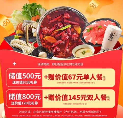 这里有一份呷哺呷哺福利指南,吃吃喝喝的快乐都帮你安排上了。在呷哺呷哺储值500元即送价值82元的礼券和价值67元的单人餐。储值800元即送价值120元的礼券和价值145元的双人餐。活动仅限北京区域的呷哺呷哺餐厅。(大兴机场,西单大悦城除外)