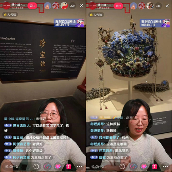 直播以VR课堂的形式通过港中旅·海泉湾抖音平台播出,与众多师生、家长及在线网友一同走进故宫珍宝馆,鉴宝聊美育,趣味学历史。活动的前一天,正是我国“文化和自然遗产日”,在这样重要的时期延续历史文脉,传播东方美学,坚定文化自信,使得此次活动格外有意义。