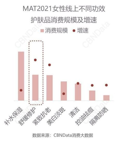 数据表明,舒缓修护类护肤品的增速远高于其他功效产品,市场前景可期。这吸引了众多护肤品公司和原料端厂商发力这一领域。