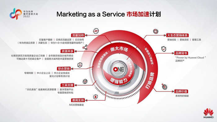 在营销增强即服务中,华为云将为伙伴提供流量加持、资源共享、联合营销、工具支撑、费用支持等5大方面的能力加持,帮助伙伴拓宽市场空间,让市场飞轮加速转起来。