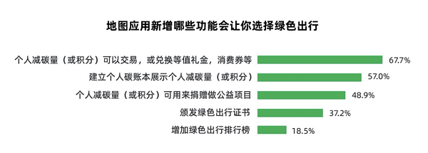 此外,有67.7%的受访者认为“碳积分” 交易或兑换等值礼金、消费券等这一功能能够更吸引自己选择绿色出行,完成“个人绿色出行-绿色行为激励”的正向闭环。这说明,目前绿色出行的市场化运作,将成为践行“双碳”的重要实施路径。