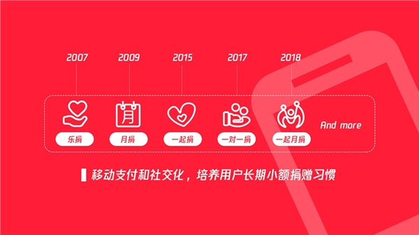 面向慈善组织,腾讯公益平台提供免费线上自助发布公益筹款项目“乐捐”服务,让每一个合法合规的公益项目都能通过微信社交连接大众获得筹款机会,并通过持续、透明的项目执行公示,接受公众和行业监督。同时通过免费开放“月捐”、“一对一”、“一起捐”、“加倍金”、“爱心券”等互联网公益产品连接慈善组织、爱心企业和公众,倡导公众长期小额捐赠,并带动家庭、社区和职场形成更加理性、健康的捐赠氛围和慈善文化。