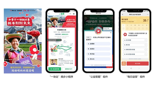 面向公众,腾讯公益平台开创行为公益玩法,先后推出“爱心接龙”、“一块走”、“每日益答”等产品和服务,让日常走路、学习、阅读、购物等生活场景融入公益慈善,极大地降低了大众参与公益门槛,增加行善乐趣,让善行日常化。