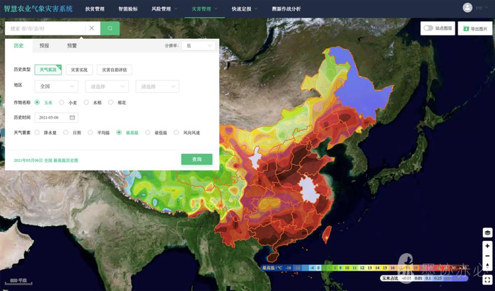 墨迹赤必凭借在气象大数据处理和行业数据融合分析方面积累的经验,在农业领域,通过打造完整的农气灾害智能监测预警、农气灾害风险区划、农气专家指标库多产品农气监测互通闭环平台, 面向“风险预警、生产管理、销售管理、产品管理、定损理赔、科技攻关”六大核心应用场景为农户提供网格化、精细化的气象预报,为企业提供农业气象灾害预报和气象灾害回溯。