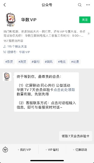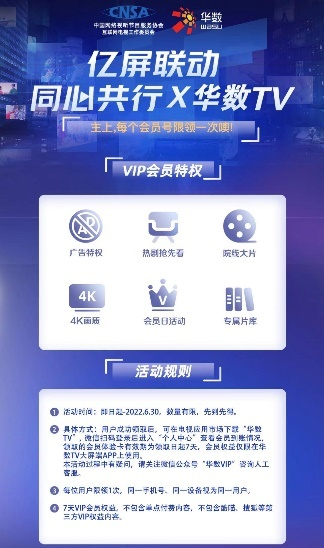 华数TV作为本次公益活动积极倡导者,主动承担社会责任与使命担当,从5月20日起,通过微信公众号“华数VIP”面向全国互联网电视用户免费发放1.5万张7天VIP会员体验卡,用户通过微信关注“华数VIP”公众号后,可点击消息链接或底部菜单栏“亿屏联动”领取体验卡,用户领取成功后可在互联网电视应用“华数TV”免费畅享电影、电视剧、综艺、少儿、体育等海量会员内容,暖心陪伴人民群众的居家生活。
