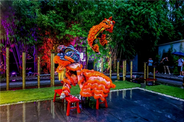 古代的宴席常以歌舞助兴。走进灯笼阵后,就能看见“古人”翩翩起舞,民乐合奏《丹凤》,手持酒杯吟咏《将进酒》,管弦钟磬、轻歌曼舞,尽显东方韵味,此情此景让嘉宾瞬间投身于古代情境中。此外,梅见还将醒狮表演融入其中,恰好将梅见品牌的国雅文化与广府文化融会贯通。