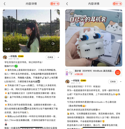 而梨梨的分享内容,则往往是站在“学生党”的角度,分享各类平价好物。如果你打开她的种草主页,则能看到她分享的东西既有“学生党性价比蓝牙耳机”,也有超可爱的耳机套,聚焦于平价好用颜值高的“一切”。