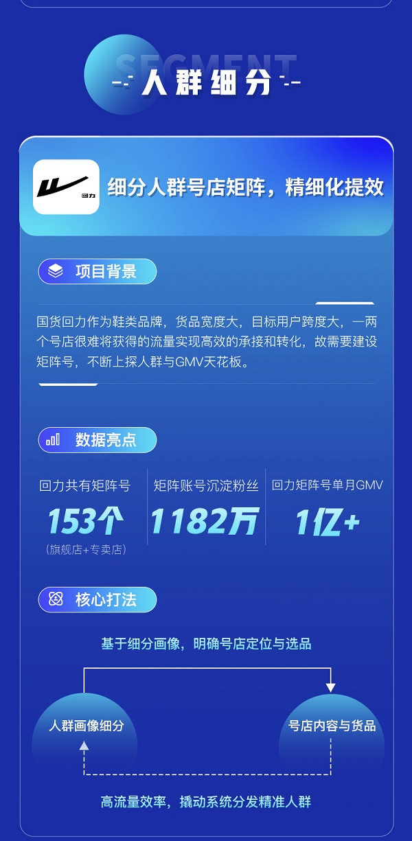 这是一种人与货进行拆解匹配的打法,它将各个不同店的流量进行了精准化区分,各个主要账号基本做到了人群和爆品的区分,由此实现了高效的承接与转化,实现了货品对不同人群的渗透与匹配,其矩阵号取得了单月度总GMV破亿的成绩。