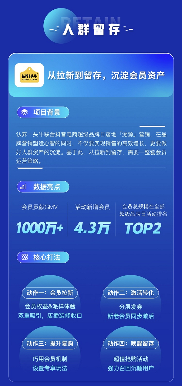 当通过内容营销实现了人群触达,拉来了新用户,如何长期留住用户?认养一头牛 4月联合抖音电商超级品牌日的落地溯源营销是沉淀用户资产的典型案例,通过会员营销策略,它实现会员贡献了超1000万+的销售额,占比全店20%以上,活动期超预期实现4.3万新增会员,其中超58%实现转化。