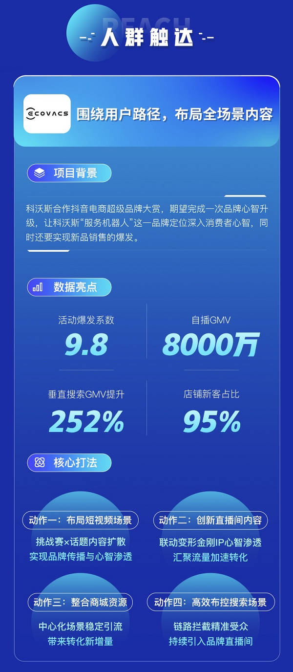 对于许多品牌商而言,在洞察消费者兴趣与需求之后,如何实现全场景触达人群是一大难点。科沃斯与抖音电商超级品牌大赏的合作,最终让科沃斯“服务机器人”这一品牌定位深入消费者心智,实现销售爆发, 是一次人群触达的经典案例。