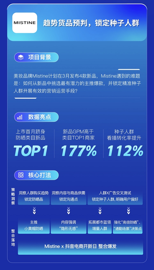 成立于1988年的泰国美妆品牌Mistine,通过抖音电商开新日活动,上市首月结算GMV超2000万,跻身防晒类目TOP3、类目新品TOP1。