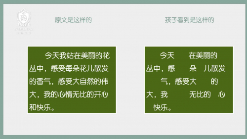 如果说一个孩子都按照左侧来读,那相比右侧漏掉了很多字,几乎不能理解文章的含义了,这就是孩子的问题和困难所在了。所以有时候不是大脑理解不了,而是输入的信息是不全的,断断续续的。本来读一篇阅读理解应该这样,结果他丢字拉字了。现在丢字拉字的孩子多不多?但是通常我们的家长都会归结为孩子的态度不够认真仔细,其实他真的是没有看到。这是视觉扫视的能力和视觉辨析能力出了问题。