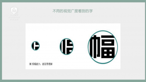 如果孩子先看到最左侧的,也就是看第一眼只看到一个字的很小一部分;再看一眼是中间的,再多看几遍才能看全,就是最右边的图。所以你就看到他抄一个字写一笔就要再看一眼,写一笔又要看一眼,写一个字要看好几眼,那就不难想象这个同学在写作业的时候是不是就会很慢?而有的孩子,他第一眼看上去就是一个完整的字,那么后面的这个孩子和前面的孩子相比写作业时间是不是几倍之差?有的孩子写作业很晚,是不是理解了,可能不是态度问题,而是一眼只能看到这样一个幅度,往往这样的孩子可能就有视觉广度能力失调的问题。我们说视幅越大,越容易理解。