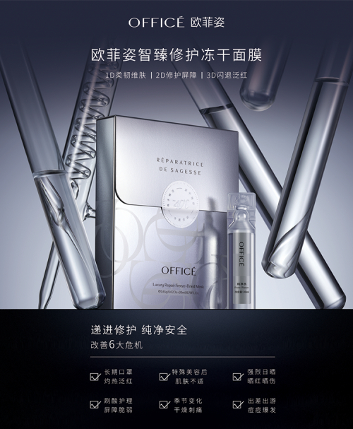 专注于为女性带来美丽的OFFICE欧菲姿品牌基于这样的背景需求下,在今年6月,全新重磅推出了“智臻修护冻干面膜”。全新上市的智臻修护冻干面膜保湿效果突显,它利用冻干黑科技在-40°C低温环境将精华封存固化于膜片上,而后在真空状态下将水分升华,保留其原有的生物活性与作用。其成分配方精简,做到真正的0防腐剂、0香精、0酒精、0色素,这极大的符合了当下消费者对于面膜安全和性能的诉求。