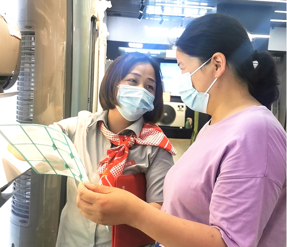 如果说,姚丽芹用现场体验让顾客“眼见为实”的认识了新家电的“魅力”。那么她的同事詹丽芳则用暖心的服务,收获了顾客的真心夸赞。