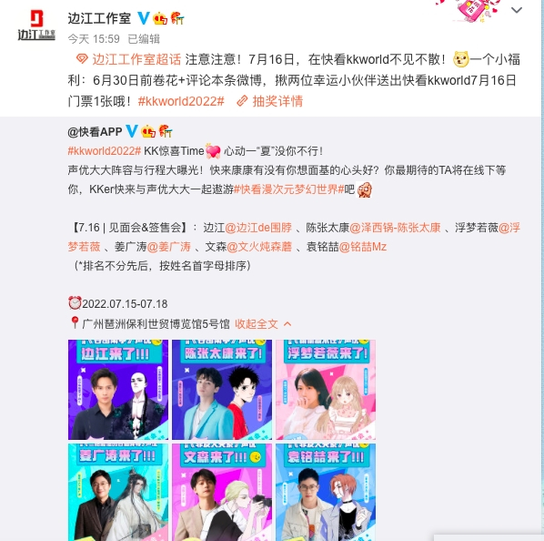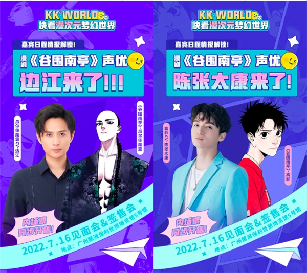 7月15日至18日,由快看世界举办、超新Z世代ACGN狂欢盛会“KK WORLD 漫次元梦幻世界”将在广州拉开帷幕。KK WORLD现场将布置一万平米的沉浸式主题园区,发布129+部超强IP片单,数十位漫画家,上百位CV、COSER、同人太太届时会亲临现场。根据最新活动情报,快看独家漫剧《谷围南亭》的CV边江、陈张太康,将在7月16日的KKV活动现场举行见面会&签售会,目前内场票已经同步开售。