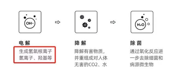 简单来说自来水在离子羟基发生器作用下分解为H+氢离子和OH氢氧根离子。