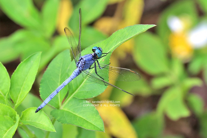 吕宋灰蜻也是常见蜻蜓之一,使用小光圈不虚化背景,可以反映它的身体细节和所在的植物环境背景。