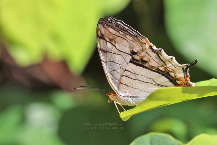 拍完正面以后,过了一会,这只网丝蛱蝶飞到了地处的树叶上,此时再找准正侧面的角度拍摄,就能表现翅另外一面的斑纹和细节。对于蝴蝶来说,有这两个角度的清晰照片,基本就能鉴定出具体的种类。