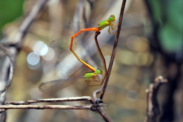 翠胸黄蟌是夏日里常见的蜻蜓,蟌俗称豆娘,是一类体型纤细的蜻蜓。在池塘边看到很多翠胸黄蟌在交配,此后雌虫就会产卵繁殖后代。它们的交配姿势很特别。对焦时可对焦在其中一只的头部,另外一只尽量找到焦平面平行的角度。