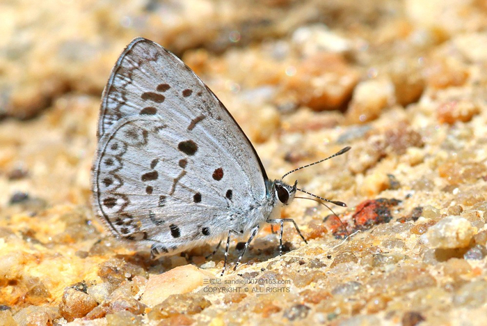 莱灰蝶也是一种小型蝴蝶,背面色彩比较黯淡,晒太阳打开翅膀时才能见到紫色泛光的艳丽色彩。长焦端拍摄可以清晰地看到翅上的鳞粉。