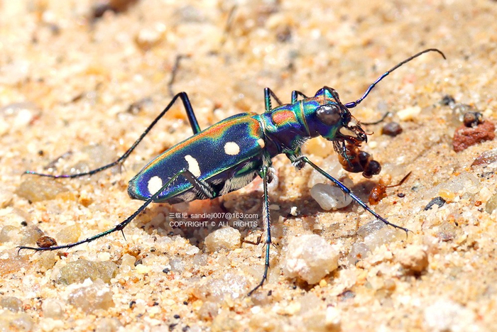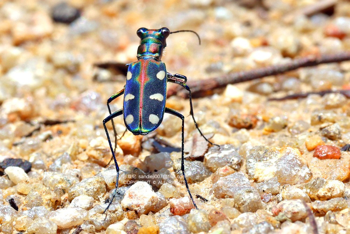 金斑虎甲是一种不到两厘米的小虫,它们有美丽的金属色,喜欢在地面短距离飞行。用500mm端记录背面和侧面,细节清晰,颜色艳丽。