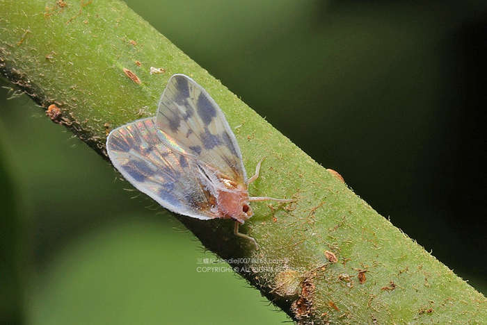 帛菱蜡蝉,仅有几毫米大小,经百微加闪光灯拍摄放大后可以看到身体细节,翅上还有金属色反光。