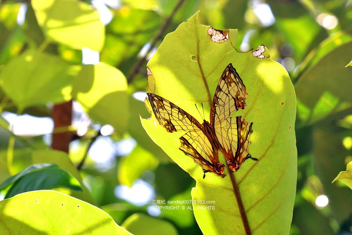 比如这只网丝蛱蝶,这种蝴蝶的花纹像地图一样错综复杂,遇见它时,它刚好在高处的一片树叶背后停歇,光透过来之后富有艺术的美感。此时蹲低选择与蝴蝶正面平行的角度,就可以呈现它正面的花纹。