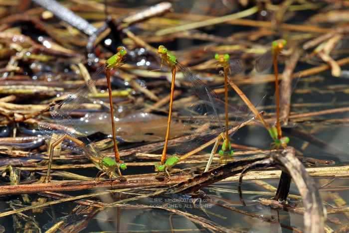 后来看到了更惊奇的场景,四只翠胸黄蟌在很近的距离同时交配。因为四只不在一个焦平面,只能选择其中一只的头部对焦,最终两只位于前景的焦点清晰,两只位于后方的虚化。虽然F13的光圈让背景看起来有些杂乱,但是真实地反映了这四只翠胸黄蟌的交配场所和环境。