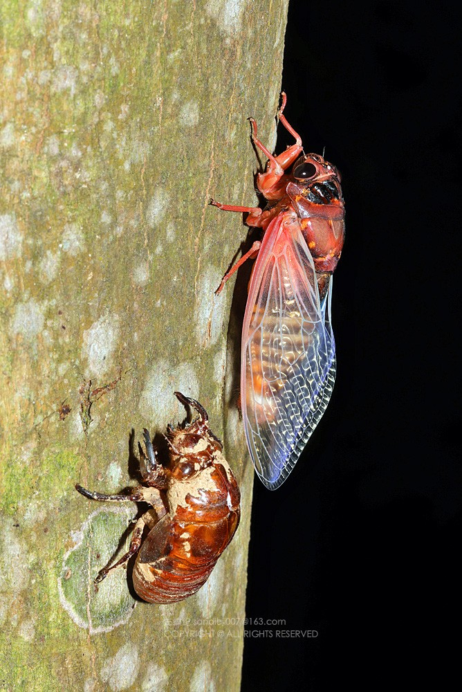 很多昆虫都会在晚上完成蜕变,以避开白天天敌的攻击。夏夜在树干上可以发现刚刚羽化的蚱蝉,蝉翼放大后是洒金粉色,裁剪以后细节依然高清。