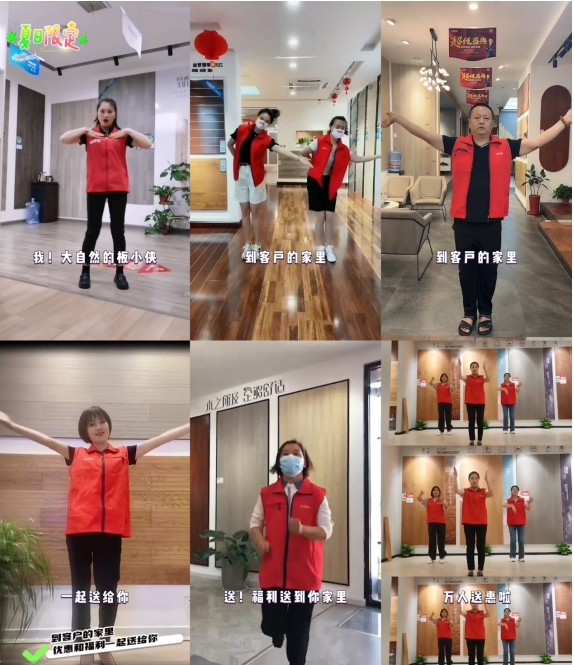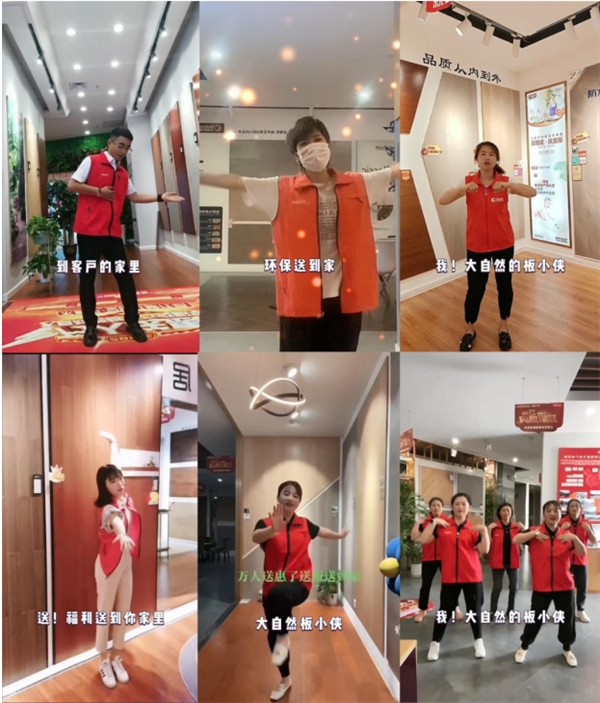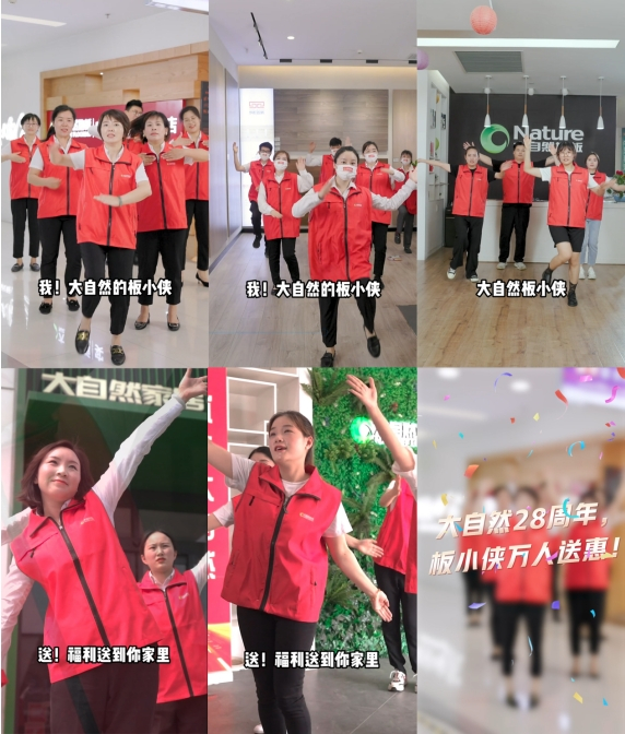 随着大自然板小侠神曲在网络爆红,线下全国门店同样也掀起全民演绎的热潮。在全国门店版本的病毒视频中,全国门店的经销商、导购等全体人员穿上板小侠战衣、大秀才艺,花式演绎板小侠神舞,为顾客带来独特专属的仪式感。病毒视频的传播, 让“大自然板小侠”这一形象在用户心中不断人格化;同时让大自然地板万人送惠&28周年千万宠粉季的活动,在重复的旋律和洗脑的歌词中,有效地扩大了传播声量,也让品牌潜移默化地刻在了消费者脑海中。