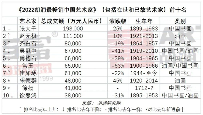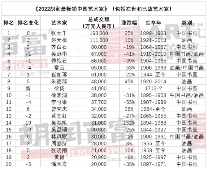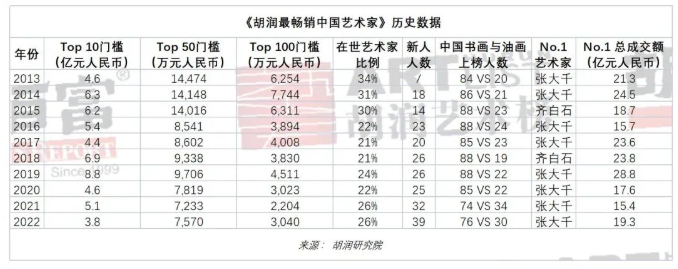 多家艺术市场信息公司(包括Artprice, ArtPro等)为此次“胡润中国艺术榜”提供了原始数据,此外,项目研究团队也从其他渠道(例如雅昌)对相关信息进行了检验。出于对价格数据可信度,公开市场交易数据选取自经筛选的样本拍卖机构,样本机构从运营时间、影响力、业内评价可信度、税收等方面综合考量,包括但不限于:苏富比(纽约、伦敦、香港、北京)、佳士得(纽约、伦敦、香港、上海)、中国嘉德(北京、香港)、永乐、北京保利、北京匡时、北京翰海、北京荣宝斋、南京荣宝斋、中贸圣佳、西泠印社、上海匡时、上海嘉禾、华艺国际、广东崇正等拍卖行。