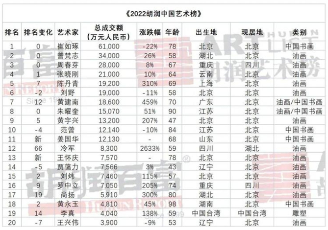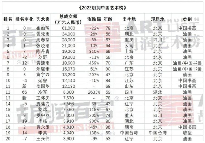 ❖58岁湖北油画家曾梵志成交额增长26%达到3.4亿元,蝉联第二