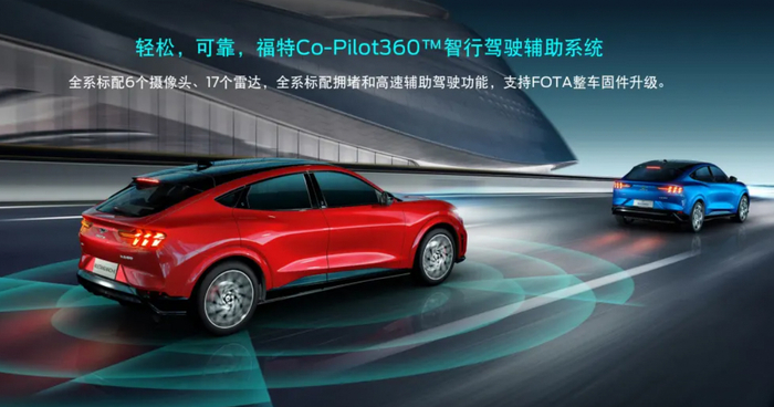 只是要拼智能驾驶,福特还真不虚。在硬件上,Mustang Mach-E标配6摄像头+17个雷达,比起特斯拉MODEL Y上的3摄像头+12个雷达要全面不少。在软件上,福特为其首发集团内的Co-Pilot360™智行驾驶辅助系统,这套系统通过融合整车上各个摄像头和雷达等传感器,支持L2+级别的自动驾驶辅助功能,可以让车主在特定高速公路上实现“准自动驾驶状态”,这也是福特中国产品阵营中首款搭载该功能的车型。