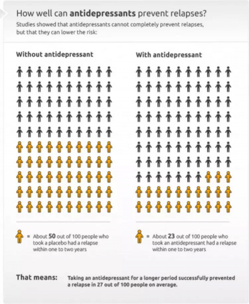 02抗抑郁药如何预防复发?抗抑郁药通常要服用一到两年甚至有时更长,以防止复发。对于已经多次复发的或者慢性抑郁症患者来说,预防复发尤为重要。研究表明,服用TCA、SSRI或SNRI等常用抗抑郁药可以降低复发风险,但不能完全预防复发。未经预防性治疗时:服用安慰剂的100人中,约有50人在一到两年内复发。预防性治疗时:服用抗抑郁药的100人中,约有23人在一到两年内复发。也就是说,长期服用抗抑郁药预防了27%的患者复发。