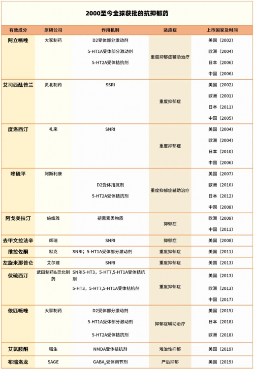 2000年以来,全球市场一共获批上市的治疗抑郁的药物一共有12个(见下表汇总)。而目前国内医疗市场中,各类抗抑郁药物达30余种,这些抗抑郁药物覆盖了各种作用机制,但是其对患者的治愈效果差别并不大。还是有相当多的患者在药物治疗后效果不明显,药物治疗抗抑郁效果非常有限。而且近十年来,抗抑郁药物的发展和抑郁症的发病相比相对比较缓慢,10年间在国内获批上市的药物仅3个:盐酸米那普仑、阿戈美拉汀和氢溴酸伏硫西汀。