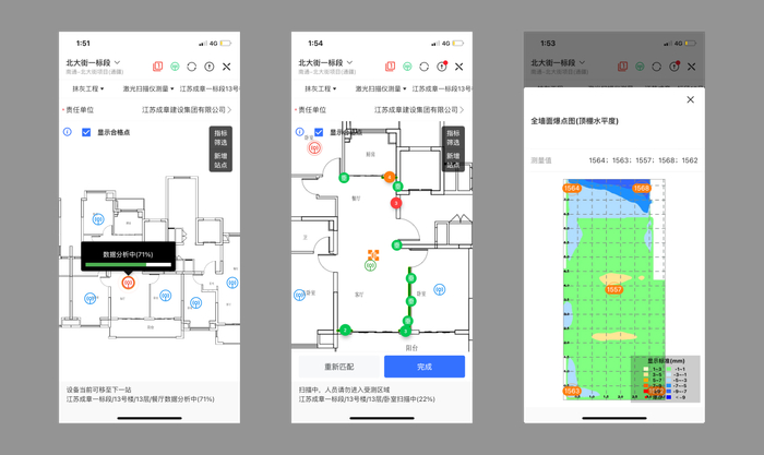 「瑞信·河狸云」通过3D扫描机器人、混凝土回弹仪和楼板测仪等智能化测量设备,可以随时对施工现场数据进行快速采集,全自动录入到「瑞信·河狸云」。不仅可以减少人工测量产生的误差,还可以提高测量效率。「瑞信·河狸云」获取到工地数据后进行系统分析,形成可视化的图表,为管控层提供一手的管理方案。