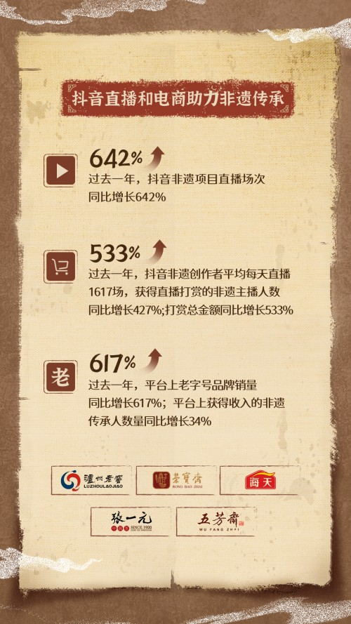 随着人们对非遗好物的购买热情上涨,众多老字号品牌也焕发了生机。据《报告》统计,过去一年,平台上老字号品牌销量同比增长617%。泸州老窖、荣宝斋、海天、张一元、五芳斋等品牌纷纷通过抖音电商拓展了新销路,开拓了更大的市场。