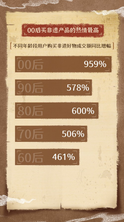 兴趣电商在非遗技艺和年轻用户之间架起了一座桥梁,年轻人购买非遗好物热情高涨。《报告》显示,过去一年不同年龄段用户购买非遗好物成交额均大幅上升。其中,00后购买热情最高,购买非遗好物的成交额与此前一年相比增长959%,“90后”“80后”“70后”“60后”购买成交额同比分别增长578%、600%、506%、461%。