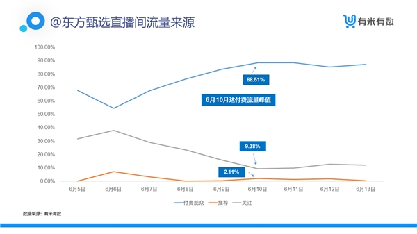 有米有数电商课堂观察到,从6月6日开始,@东方甄选的直播间付费观众来源占比逐步增加,在6月10日当晚达到峰值,付费观众占比高达九成,创造最高在线人数10万+的佳绩。