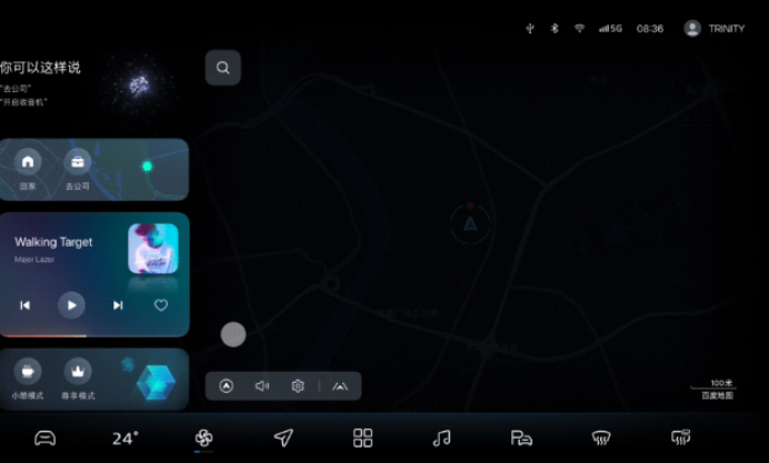 飞凡RISING OS智舱交互系统采用自适应光感界面,通感自然,冷暖光随时间变换,为用户打造实时沉浸式的交互体验;拟物式ICON设计,通过简洁的线条以及柔和棱角,保留拟物特点,可一眼清晰看懂各种功能信息;智能语音助手,采用极简的星体环绕结构,明暗交错,光效流动,展现语音接收、回应、待机功能。