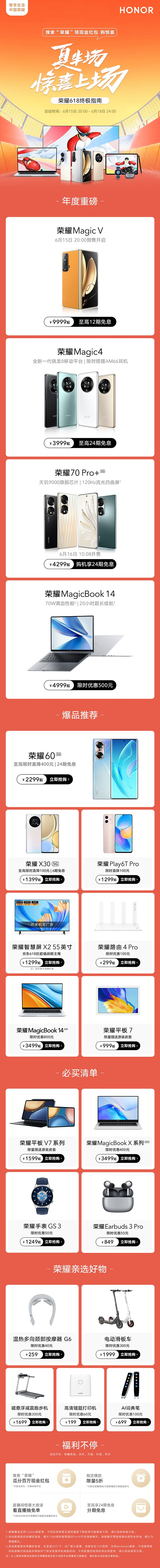 今年荣耀618惊喜福利根本停不下来,荣耀Magic V售价9999元起,至高享12期免息。荣耀Magic4系列3999起,至高享24期免息。新品荣耀70 Pro+ 6月16日10:08分开售,4299元起,购机享24期免息。荣耀Magicbook 14限时优惠500元,售价仅4999元起。荣耀618优惠多多,让你以更实惠的价格享受荣耀最新的科技产品。
