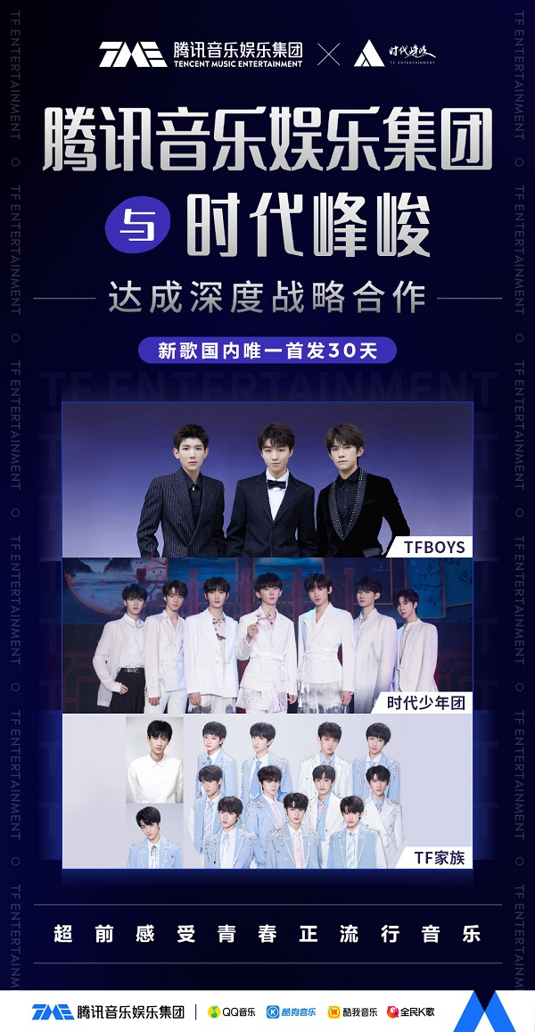 近日,腾讯音乐娱乐集团(下文简称为TME)与时代峰峻共同宣布:基于长期紧密的合作关系,双方续签深度战略合作协议。此次续签后,TME旗下QQ音乐、酷狗音乐、酷我音乐、全民K歌将作为国内唯一首发30天的音乐流媒体平台,乐迷们不仅可以超前听到时代峰峻旗下TFBOYS、时代少年团、TF家族等青春正流行的优质音乐作品,更将体验创新丰富的一站式音娱互动。