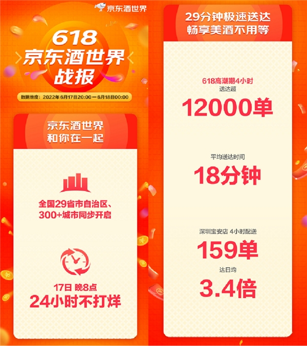 今年以全新业务模式进入酒水市场的京东酒世界在线上线下同步开启618大促,全国29省市自治区、300多个城市的千家门店同频展开大促活动,并在17日晚8点高潮期开启了24小时不打烊模式。优质的酒水、优异的价格、优秀的服务,让京东酒世界成为了今年618期间很多酒水消费者的首选。618高潮期4小时,京东酒世界门店送达订单超12000单,平均送达时间为18分钟,几乎下楼逛店买酒的功夫,酒水就被送到了家门口,各地门店也在不断地刷新着纪录,其中深圳宝安店在618高潮期4小时内,将门店配送员加增至6人,配送达159单,超门店日均3.4倍。